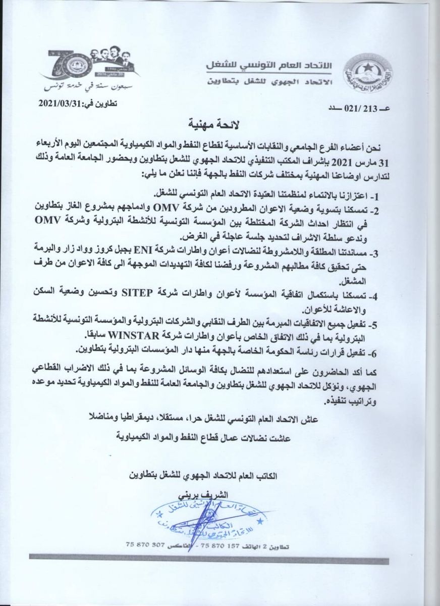 كما عبر أعضاء الفرع عن مساندتهم لكافة مطالب اعوان واطارات شركة 'إيني' بوادي زار وجبل كروز والبرمة وتحسين وضعية السكن والاعاشة لأعوان شركة 'سيتاب' وتفعيل كافة الاتفاقيات المبرمة بين الطرف النقابي والشركات البترولية والمؤسسة التونسية للأنشطة البترولية بما في ذلك الاتفاق الخاص باعوان واطارات شركة winstar وتفعيل كافة قرارات رئيس الحكومة الخاصة بالجهة.