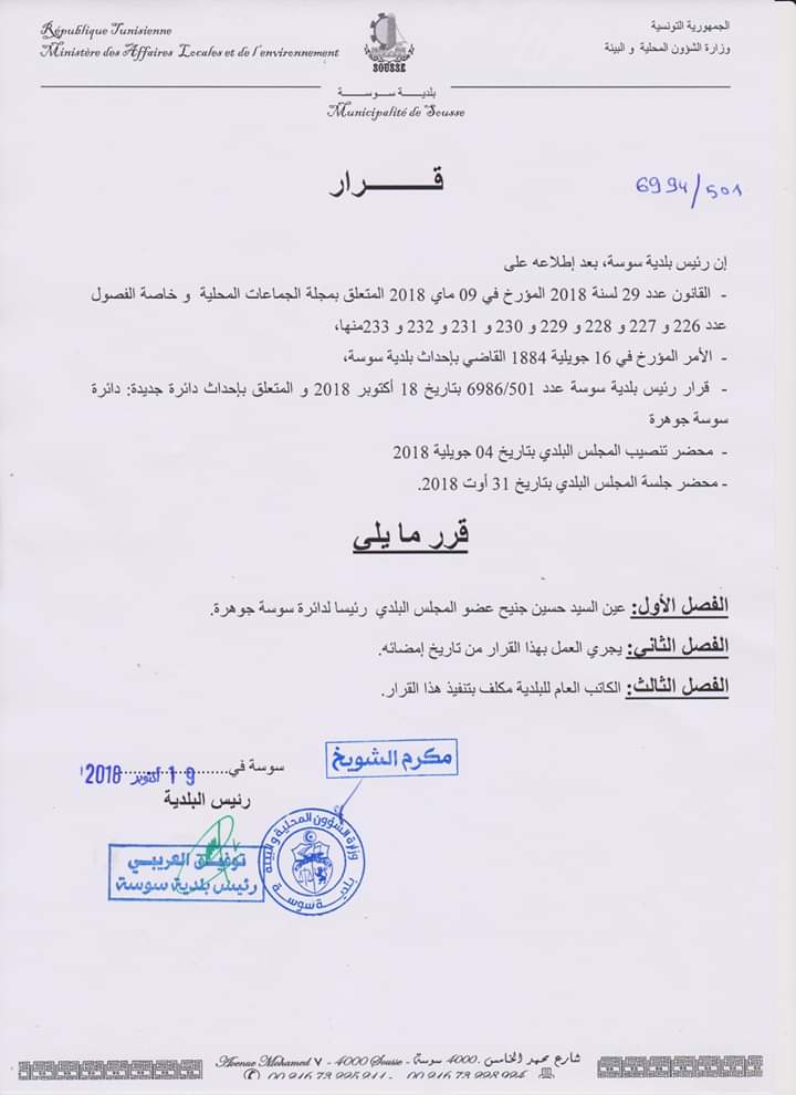 و قد جاء قرار رئيس بلدية سوسة بعد إطلاعه على القانون عدد 29 لسنة 2018 المؤرخ في 9 ماي 2018 والمتعلق بمجلة الجماعات المحلية وخاصة الفصول عدد 226 و227 و228 و229 و230و231و232و233 منها، والأمر المؤرخ في 16 جويلية 1884 القاضي بإحداث بلدية سوسة، قرّر إحداث دائرة جديدة وهي دائرة سوسة جوهرة.