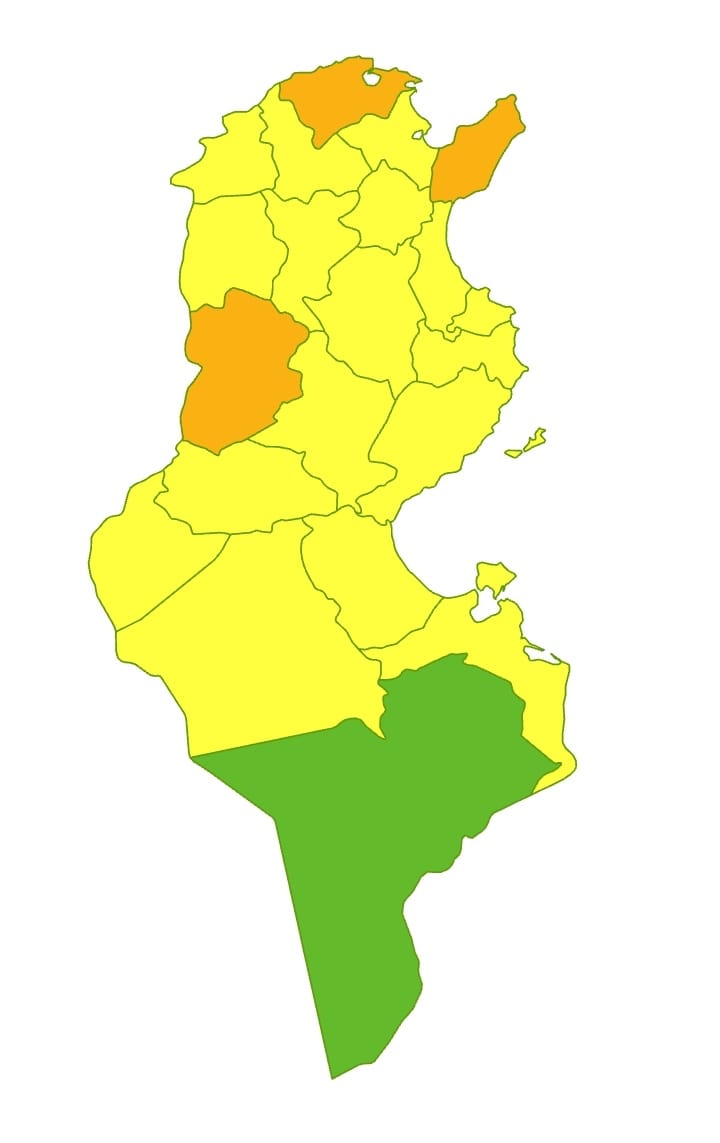 وأكّد المعهد أنّ الولايات، التي اسند لها اللون الأصفر، يرجى توخي الحذر أثناء ممارسة الأنشطة اليومية.