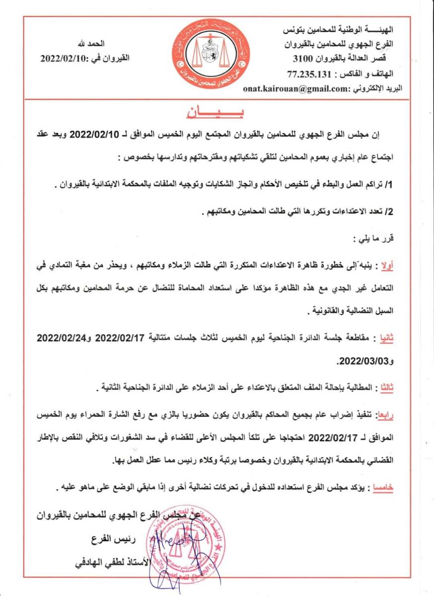 قرّر أعضاء الفرع الجهوي للمحامين اليوم الخميس 10 فيفري 2022 تنفيذ إضراب عام حضوري بجميع محاكم القيروان مع ارتداء الزي ورفع الشارة الحمراء يوم الخميس المقبل الموافق ل17 فيفري وذلك عق اجتماع عام عقده الفرع.