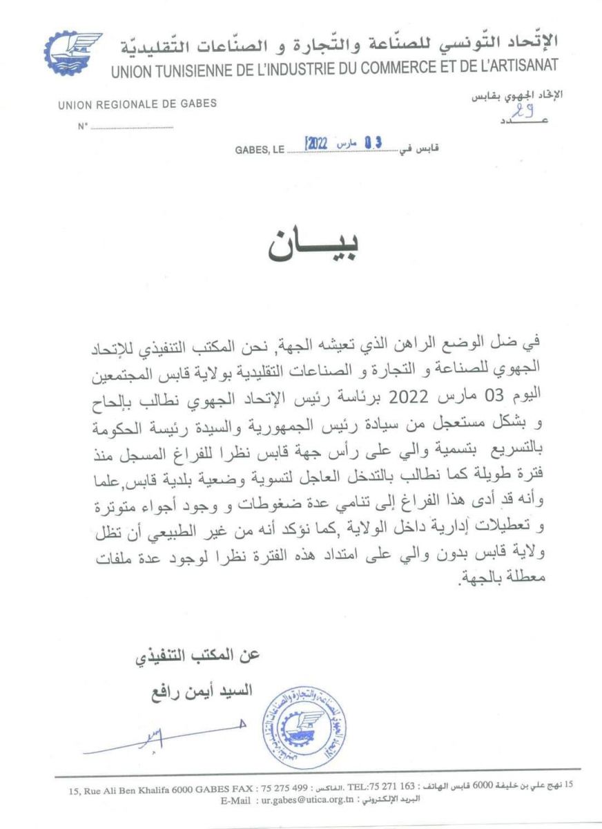 طالب الاتحاد الجهوي للصناعة والتجارة والصناعات التقليدية في بيان، رئيس الجمهورية بتسمية وال على قابس وبحل مشكل تعطل العمل في بلدية الجهة بسبب إضراب عمال النظافة الذي تجاوز الشهرين.