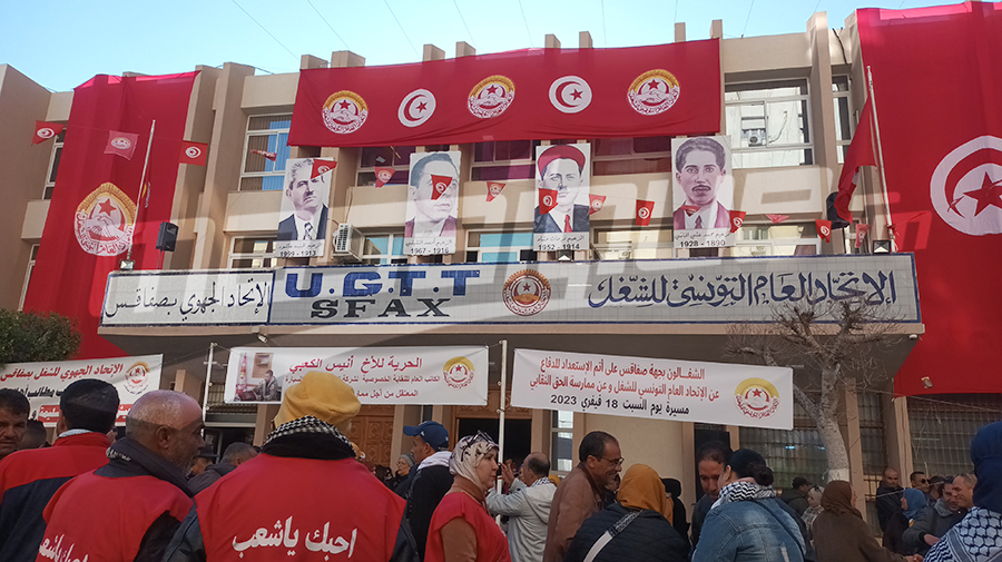 ينفّذ الاتحاد الجهوي للشغل بصفاقس اليوم السبت 18 فيفري 2023، تجمعا عماليا كبيرا بإشراف الأمين العام المساعد للإتحاد العام التونسي للشغل عثمان الجلولي، استجابة لمقررات الهيئة الإدارية الوطنية بتنظيم تجمعات وتحركات نقابية بكامل الجهات.