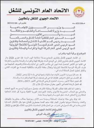 دعا الاتحاد الجهوي للشغل بتطاوين منظوريه بشركة البيئة إلى تنفيذ إضراب حضوري عن العمل يوم الثلاثاء 28 فيفري 2023.