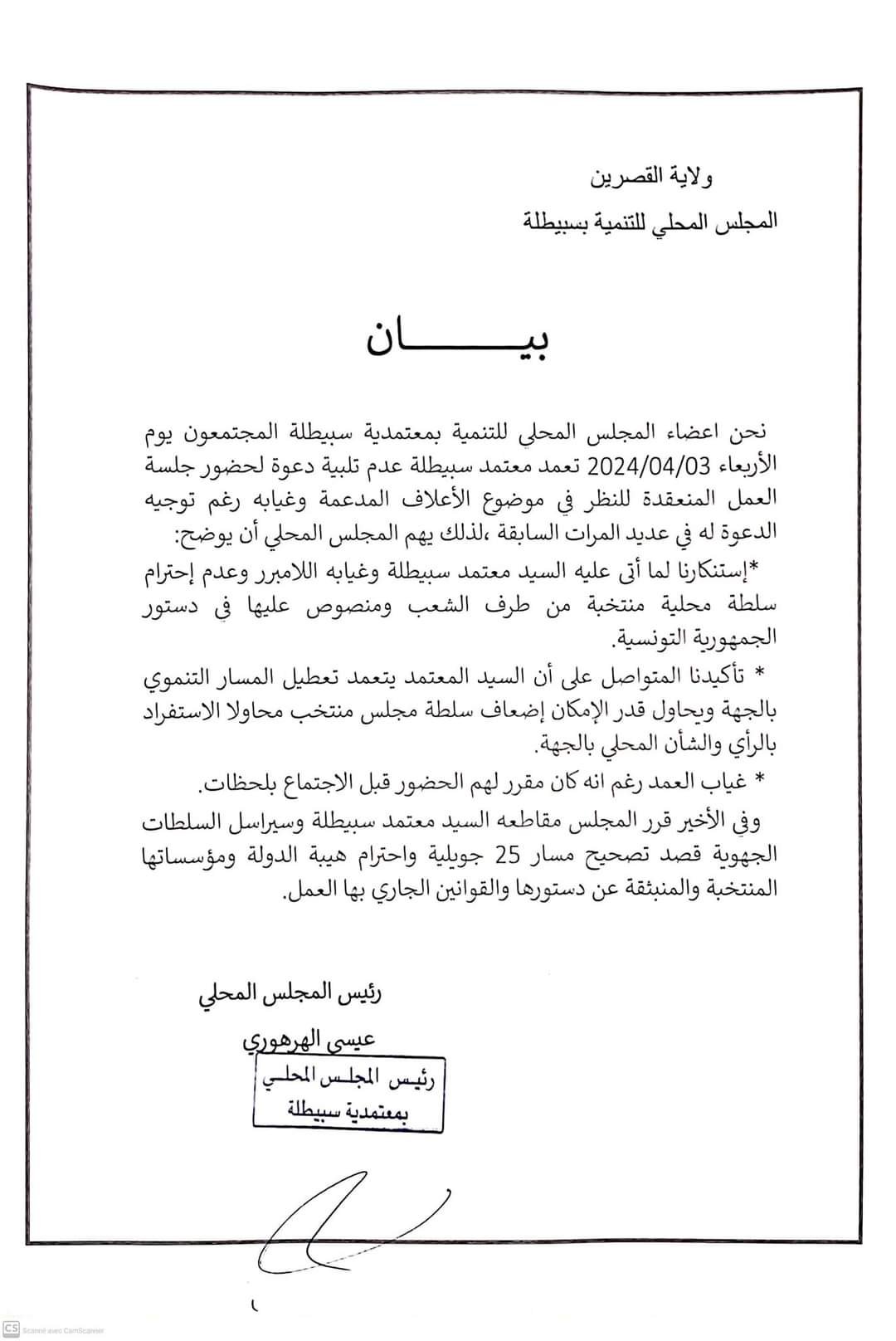 نشر المجلس المحلي للتنمية بمعتمدية سبيطلة بلاغا اتهم فيه معتمد سبيطلة بـ''عدم احترام المجلس وتعطيل مسار التنمية بالمنطقة بسبب غيابه عن جلسة عمل مخصصة لمجال الأعلاف''، وفق نص البلاغ.