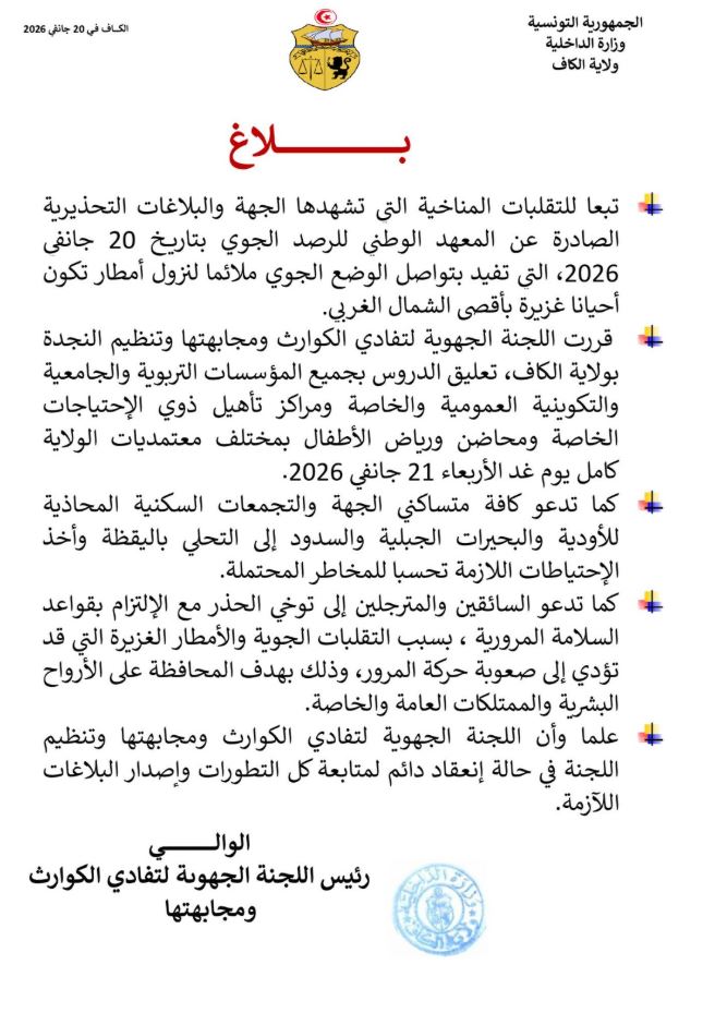 يُذكر أنّه تقرّر تعليق الدروس بجميع المؤسسات التربوية والجامعية والتكوينية العمومية والخاصة ومراكز تأهيل ذوي الإحتياجات الخاصة ومحاضن ورياض الأطفال بمختلف معتمديات الولاية كامل يوم غد الأربعاء 21 جانفي 2026.