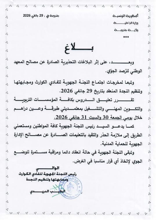 قررت اللجنة الجهوية لتفادي الكوارث ومجابهتها وتنظيم النجدة في ولاية جندوبة تعليق الدروس بكافة المؤسسات التربوية والتكوين المهني والتشغيل بمعتمديتي طبرقة وعين دراهم خلال يومي الجمعة 30 والسبت 31 جانفي 2026، وذلك إثر البلاغات التحذيرية الصادرة عن مصالح الرصد الجوي.