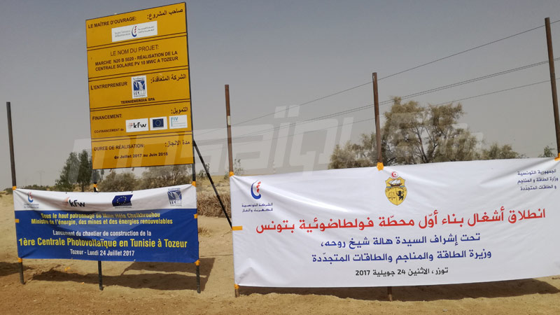 أعطت وزيرة الطاقة والمناجم والطاقات المتجدّدة هالة شيخ شارة انطلاق انجاز أول محطة فوطوضوئية لتوليد الكهرباء باعتماد الطاقة الشمسية بتوزر اليوم الاثنين 24 جويلية 2017.