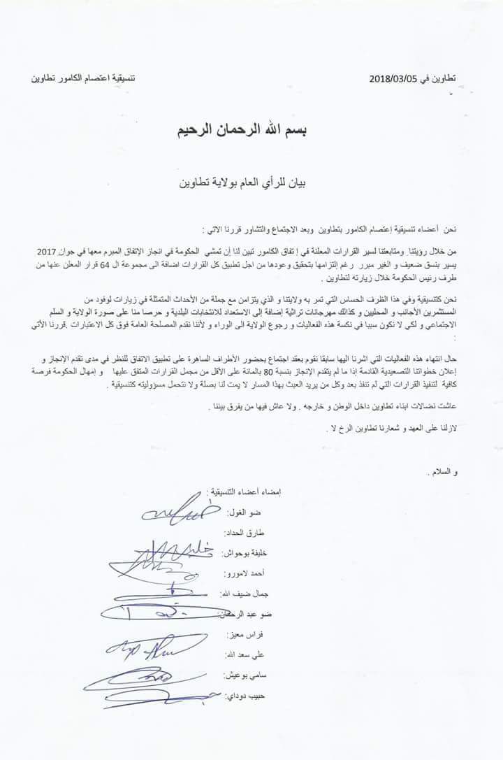 في المقابل طالبت التنسيقية بعقد جلسة تجمع كل الأطراف الممضية على الاتفاق أواخر شهر مارس لتقييم مسار التنمية ووضع استراتيجية للخطوات الاحتجاجية القادمة في صورة ما لم تتجاوز نسبة إنجاز القرارات 80%،.ويشار إلى تخلف الناطق الرسمي باسم التنسيقية، طارق الحداد وفراس معيز عن الجلسة بسبب إصرارهما على مواصلة الاحتجاجات والضغط على الحكومة، حسب مراسلنا بالجهة.