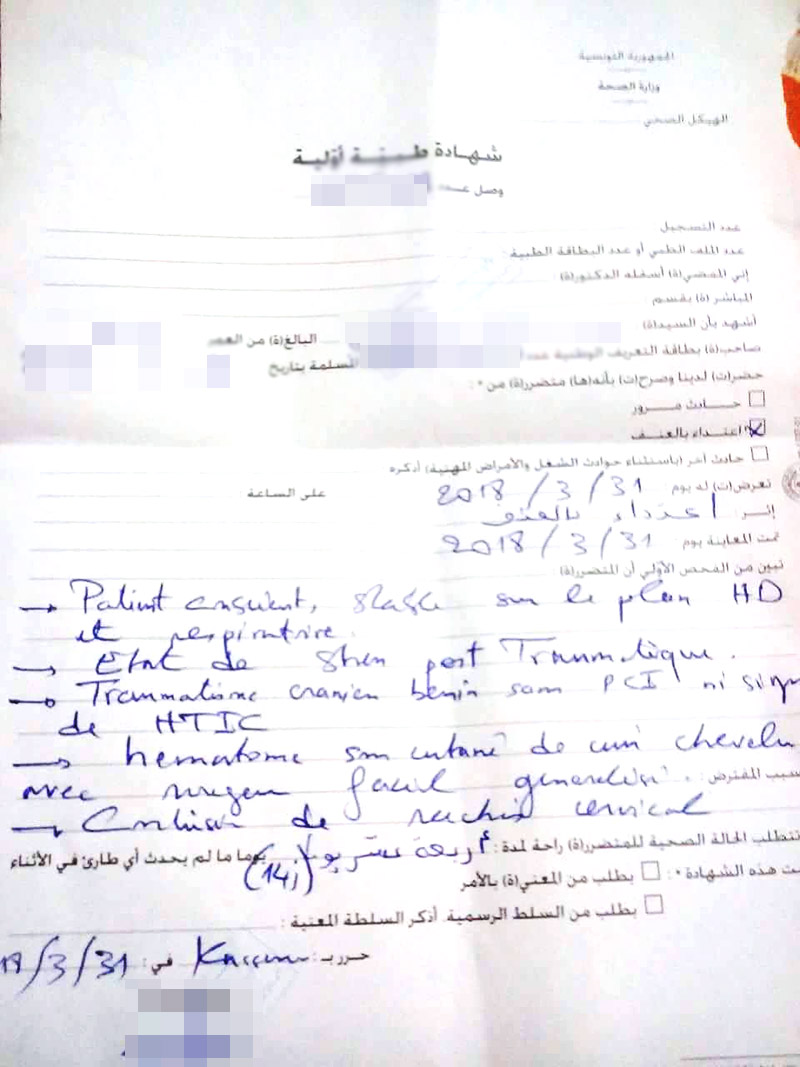 وقد تحصلت موزاييك على نسخة من شهادة طبية تنص على 14 يوما راحة مرضية سلمت للطفل الذي يبلغ من العمر 9 سنوات .