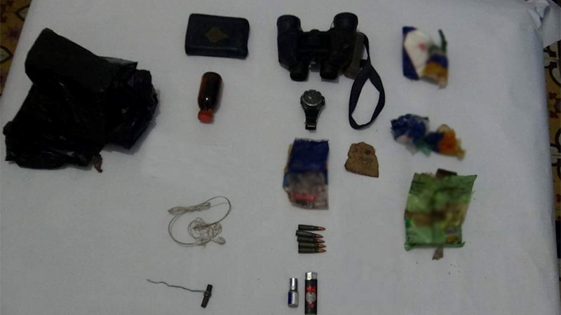 كما تم العثور بحوزته على حقيبة ظهر تحتوي على مؤونة، منظار نهاري، كنانتيْن، 5 خراطيش عيار 7.62 مم.