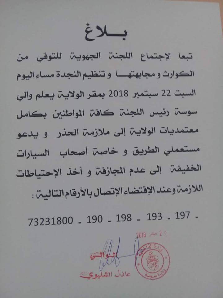 دعت اللجنة الجهوية بسوسة للتوقي من الكوارث ومجابهتها وتنظيم النجدة في بلاغ السبت 22 سبتمبر 2018 المواطنين بكامل معتمديات ولاية سوسة إلى ملازمة الحذر في ظل أمطار غزيرة تشهدها المنطقة حاليا وطالبتهم بعدم المجازفة وأخذ الاحتياطات اللازمة.