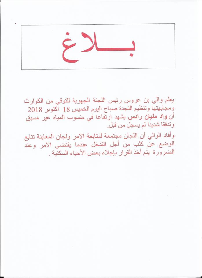 أكّد والي بن عروس عبد اللطيف الميساوي في برنامج صباح الناس الخميس 18 أكتوبر 2018 تسجيل ارتفاع منسوب المياه بوادي مليان صباح اليوم من قبل خبراء وزارة الفلاحة والموارد المائية .