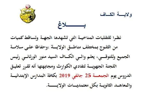 أعلن والي الكاف منور الورتاني على الصفحة الرسمية للولاية تعليق الدروس غدا الجمعة 25 جانفي 2019 في كافة المؤسسات التربوية نظرا للتقلبات المناخية وتزايد تساقط  الثلوج بالولاية.