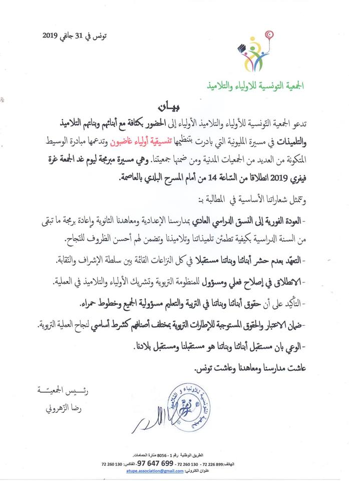 دعت الجمعية التّونسية للأولياء والتلاميذ في بيان الأولياء إلى الحضور بكثافة مع أبنائهم في المسيرة المليونية التي بادرت بتنظيمها غدا تنسيقية أولياء غاضبون وتدعمها مبادرة الوسيط المكونة من جمعيات عديدة .