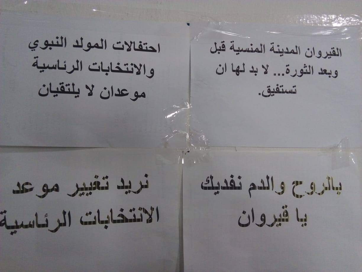 دخل مساء اليوم الخميس 21 مارس 2019 نشطاء من المجتمع المدني في اعتصام مفتوح بمقر الهيئة الفرعية للانتخابات بالقيروان مطالبين بتغيير موعد الانتخابات الرئاسية نظرا لتزامنها مع إحتفالات المولد النبوي الشريف.