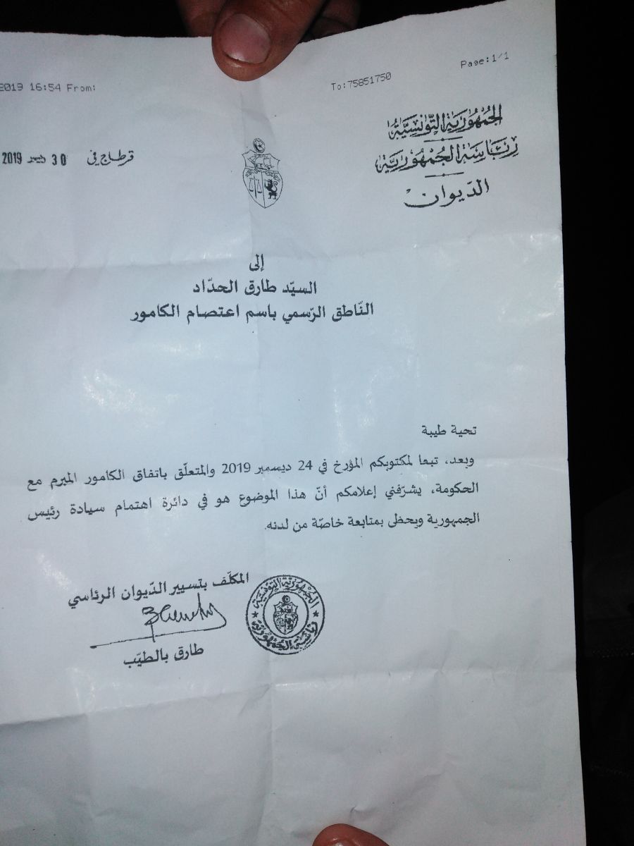 تلقى شباب الكامور المعتصم بساحة مقر ولاية تطاوين و المضربين عن الطعام منذ يومين مساء اليوم الاثنين فاكسا من رئاسة الجمهورية باسم الناطق الرسمي طارق الحداد تأكد من خلاله أن موضوع اتفاق الكامور المبرم مع الحكومة هو في دائرة اهتمام رئيس الجمهورية و يحضى بمتابعة خاصة من قبله.