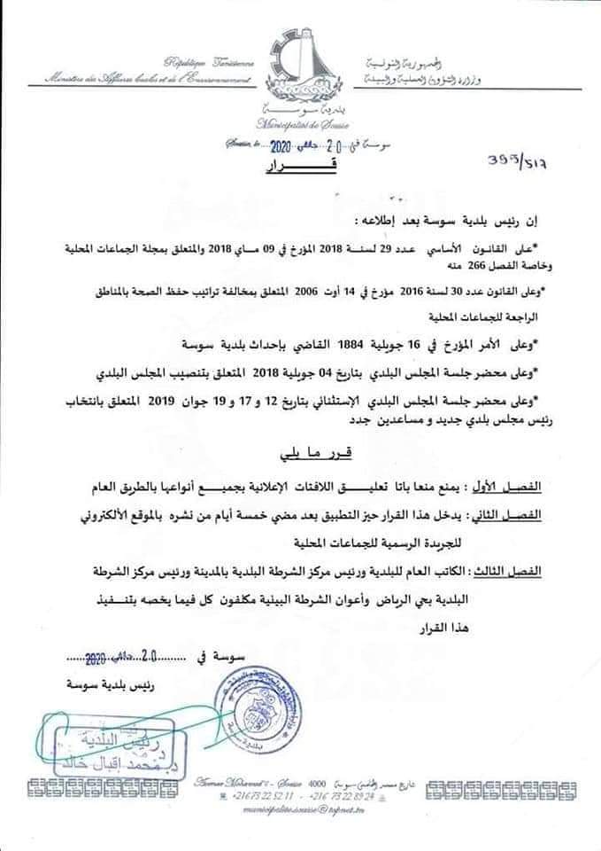 قرّرت بلدية سوسة منع تعليق اللافتات الإعلانية بجميع أنواعها بالطريق العام، ويدخل هذا القرار حيز التطبيق بعد مضي خمسة أيام من نشره بالموقع الالكتروني للجريدة الرسمية للجماعات المحلية.