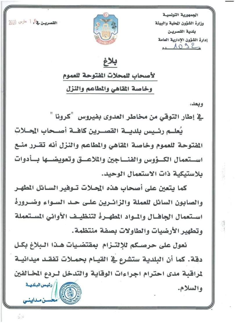 قررت بلدية القصرين المدينة اليوم الثلاثاء 10 مارس 2020، منع استعمال الكؤوس والملاعق والفناجين داخل المقاهي والمطاعم والنزل وتعويضها بأدوات بلاستيكية توقيا من الكورونا، وفق بلاغ صدر عن البلدية.
