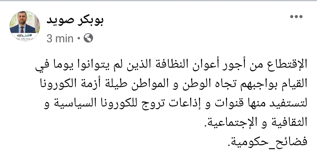 عبر رئيس بلدية تطاوين بوبكر صويد، اليوم الجمعة 08 ماي 2020، في تدوينة نشرها على صفحته الرسمية على فايسبوك عن استيائه من إقدام الحكومة على الإقتطاع من أجور عمال النظافة والبلديات الذين قال أنهم:" لم يتوانوا يوما في القيام بواجبهم تجاه الوطن والمواطن طيلة أزمة الكورونا لتستفيد منها قنوات و إذاعات تروج للكورونا السياسية و الثقافية و الإجتماعية"، واصفا ذلك ب "فضائح حكومية".