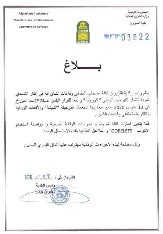 دعت بلدية القيروان المدينة اليوم السبت 1 أوت 2020 في بلاغ كافة أصحاب المقاهي وقاعات الشاي إلى عدم استعمال النرجيلة "الشيشة" والألعاب الورقية والفكرية مع ضرورة احترام كافة شروط وإجراءات الوقاية الصحية ومواصلة استخدام الأكواب  "gobelets " والملاعق الغذائية ذات الاستعمال الواحد.