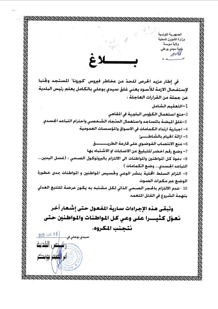 أصدرت بلدية سيدي بوعلي اليوم الإثنين بلاغا أعلنت من خلاله عن جملة من القرارات العاجلة في إطار مزيد الحرص على الحد من تفشي فيروس كورونا.