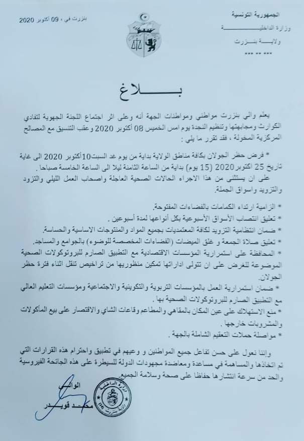 أعلنت ولاية بنزرت في بلاغ مساء اليوم الجمعة 9 أكتوبر 2020 إقرار حظر التجوّل في كامل الولاية بداية من الغد السبت 10 أكتوبر من الساعة التاسعو ليلا وإلى غاية الخامسة صباحا لمدة 15 يوما.