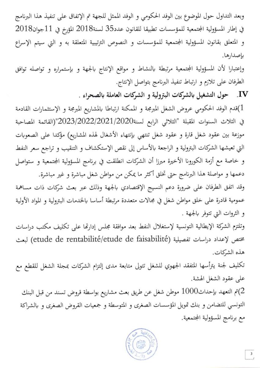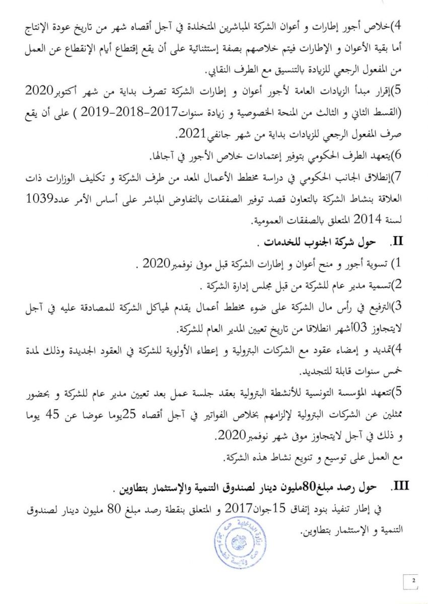 وتتعلق النقاط أساسا بشركة البيئة و شركة الجنوب للخدمات و صندوق التنمية 80 مليون دينار و التشغيل بالشركات البترولية، كما تم إقرار عدم التتبع عدليا بالنسبة للاحتجاجات السلمية مع التزام الوفد المفاوض الممثل لولاية تطاوين برفع كافة أشكال الاعتصام و عدم ارتهان الثروات الوطنية لأي احتجاجات او تحركات اجتماعية.