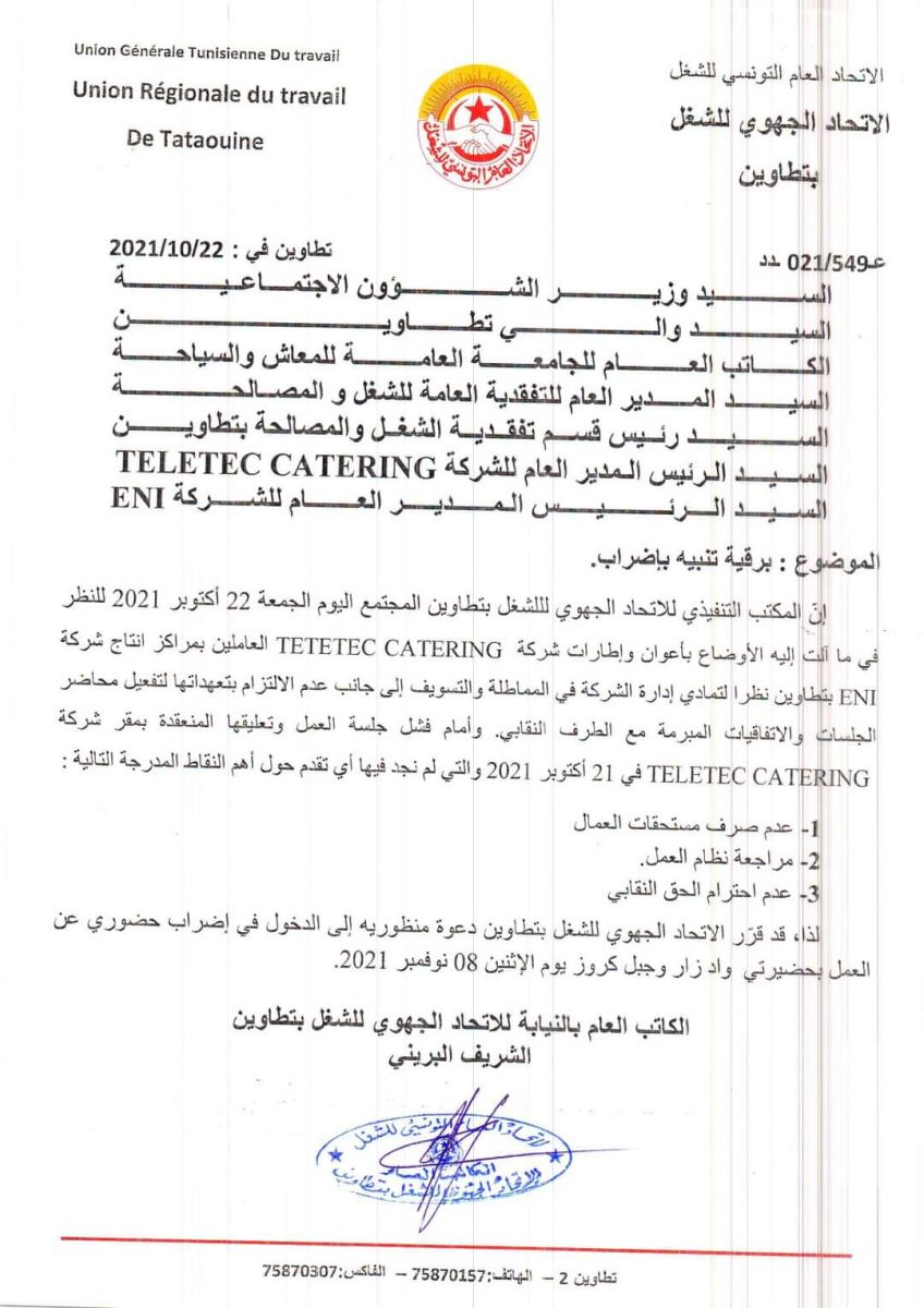 دعا الاتحاد الجهوي للشغل بتطاوين منظوريه بشركة teletec catering العاملين بمراكز إنتاج شركة eni إلى الدخول في إضراب حضوري عن العمل بحضيرتي واد زار وجبل كروز يوم الاثنين القادم، احتجاجا على ما وصفه الاتحاد بسياسة المماطلة والتسويف المعتمدة من طرف الشركة وعدم التزامها بالمحاضر والاتفاقيات المبرمة مع الطرف النقابي وفق ماجاء في بيان نشره الاتحاد الجهوي للشغل بتطاوين على صفحته الرسمية .