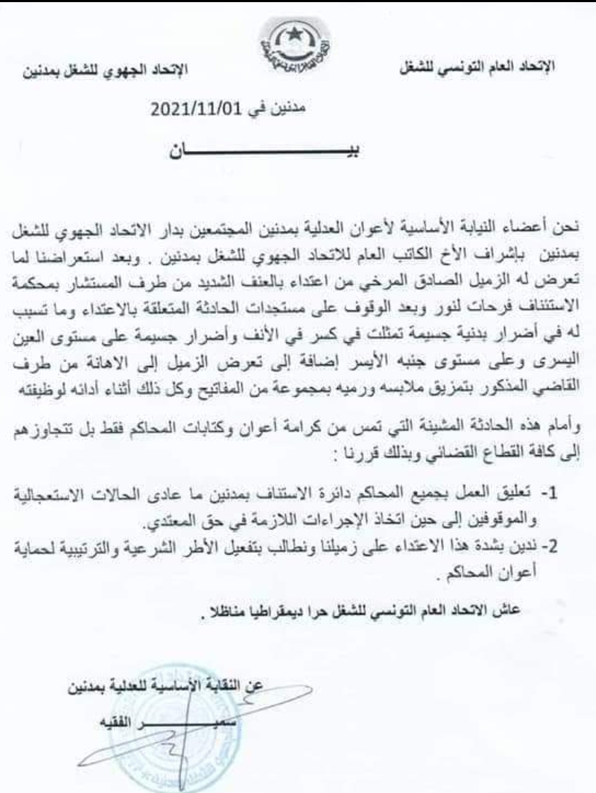 وطالبت النقابة باتخاذ الإجراءات اللازمة ضد القاضي مع المطالبة بتفعيل الأطر التشريعية والترتيبية لحماية أعوان المحاكم.