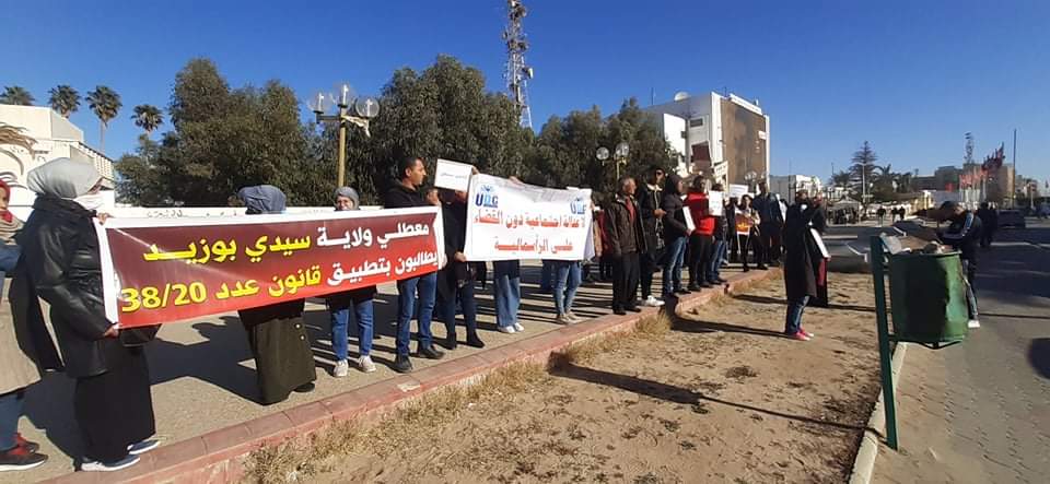 انتظم اليوم الخميس 2 ديسمبر 2021 تحرك إحتجاجي جهوي بساحة الشهيد محمد البوعزيزي بمدينة سيدي بوزيد شارك فيه عدد هام من " إتحاد أصحاب الشهادات المعطلين عن العمل " و تنسيقية الإنتداب حقي لمن طالت بطالتهم " و آخرين من عموم المعطلين عن العمل للتعبير عن رفضهم المطلق لما أسموه بسياسة " الوعود الزائفة و تأبيد البطالة  " من جهة  وللمطالبة بحقهم في التشغيل و في الكرامة الوطنية و ذلك من خلال تفعيل قانون 38 لسنة 2020  الذي كان نتيجة لنضالات دامت سنتين تنظم من خلالها المعطلون عن العمل من أصحاب الشهادات العليا بكامل البلاد، و فق تعبيرالمحتجين.