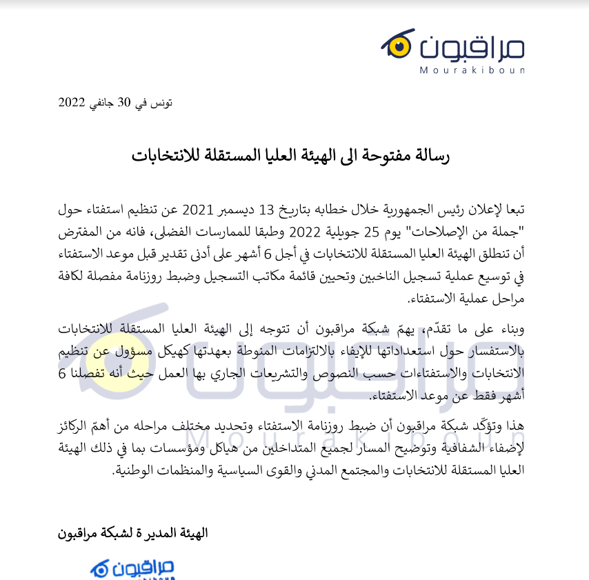 توجّهت شبكة مراقبون برسالة مفتوحة إلى الهيئة العليا المستقلة للانتخابات، اليوم الأحد 30 جانفي 2022، طلبا لجملة من الاستفسارات حول استعداد الهيئة لتنظيم الاستفتاء المقرّر في 25 جويلية 2022 حسب ما أقره رئيس الجمهورية قيس سعيّد.