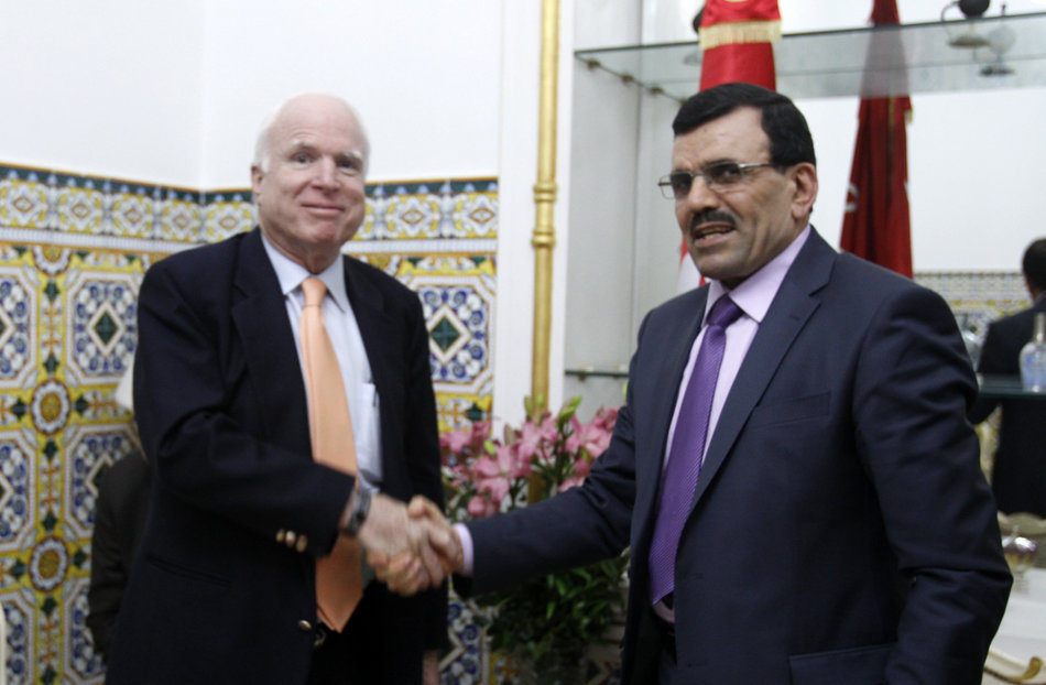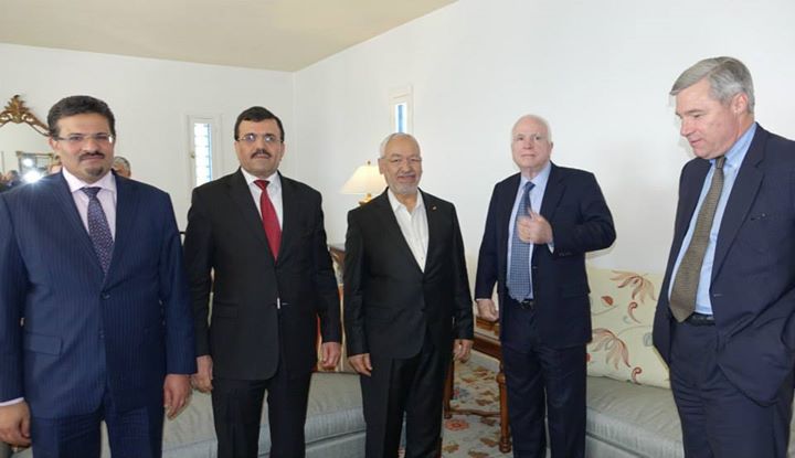 تواترت زيارات الطيار السابق في البحرية الأمريكية، والسيناتور المثير للجدل، جون ماكين، إلى تونس، وكان في كل مرة يظهر إهتماما وتعاطفا خاصا مع الثورة التونسية والتحولات السياسية التي شهدتها.. وكانت أولى زياراته المعلنة بُعيد سقوط نظام بن علي، وآخرها سنة 2015، وفي كل زيارة له كان ماكين يحرص على لقاء قيادات حركة النهضة.