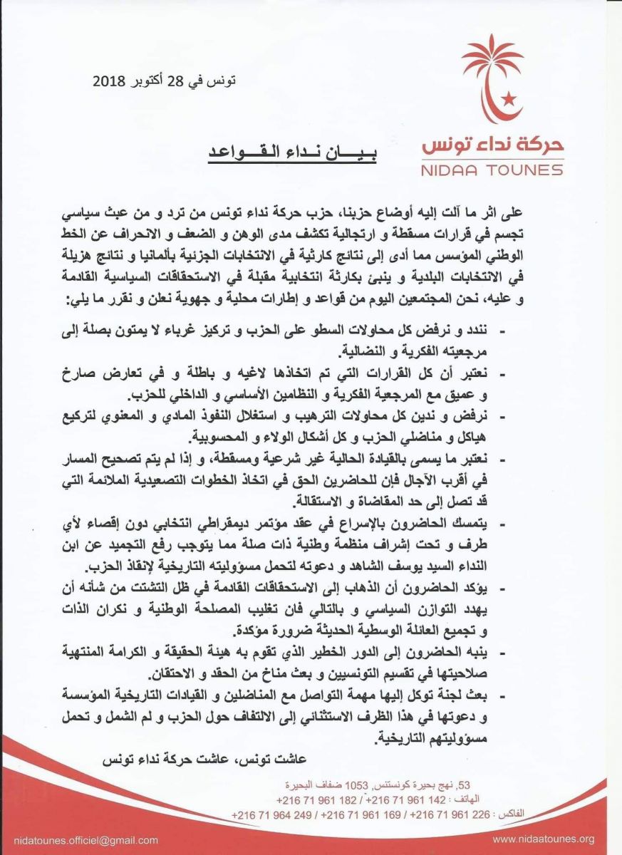 كما رفض كل أشكال الترهيب واستغلال النفوذ المعنوي لتركيع هياكل ومناضلي الحزب من قبل قيادة وصفها بأنها "غير شرعية"، داعيا إلى تجميع كل القوي الوطنية الديمقراطية التي لها نفس المرجعية الفكرية مع نداء تونس والاستعداد إلى المواعيد الانتخابية القادمة ضمن جبهة موحدة .