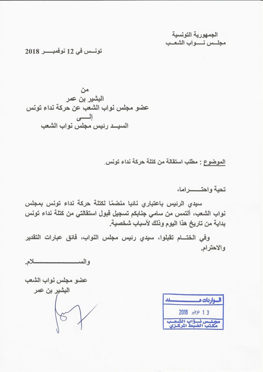 تقدّم النائب بشير بن عمر بمطلب استقالة من كتلة حركة نداء تونس منذ 12  نوفمبر 2018 وأودعها مكتب الضبط المركزي بمجلس نواب الشعب بتاريخ اليوم الثلاثاء 13 نوفمبر 2018، وفق وثيقة الاستقالة التي تحصلت موزاييك على نسخة منها.