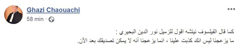 نشر القيادي في التيار الديمقراطي والنائب في البرلمان غازي الشواشي تدوينة عبر صفحته بفايسبوك وجه من خلالها '' رسالة'' إلى النائب والقيادي في حركة النهضة نور الدين البحيري، جاء فيها '' ما يزعجنا ليس أنك كذبت علينا، وإنما يزعجنا أنه لا يمكن تصديقك بعد الآن''.