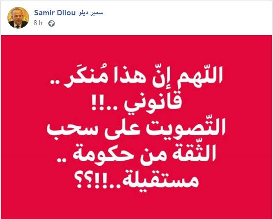نشر النائب والقيادي في حركة النهضة سمير ديلو تدوينة عبر صفحته الرسمية في فايسبوك، إعتبر فيها ''التصويت على سحب الثقة من حكومة مستقيلة مُنكر قانوني.