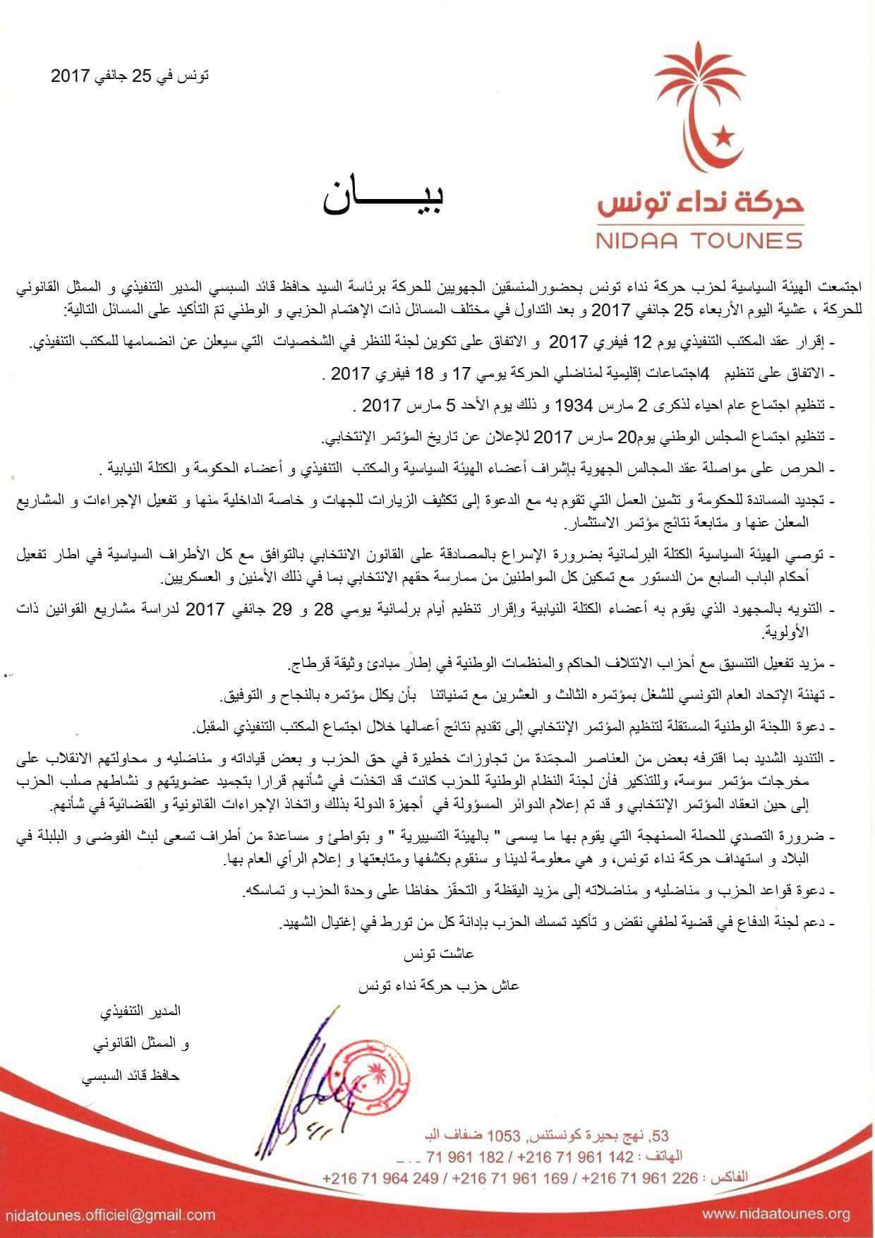 وجاء في البيان أنّه تمّ إقرار عقد المكتب التنفيذي يوم 12 فيفري 2017  والاتفاق على تكوين لجنة للنظر في الشخصيات  التي سيعلن عن انضمامها للمكتب التنفيذي، مع تنظيم اجتماع المجلس الوطني يوم20 مارس 2017 للإعلان عن تاريخ المؤتمر الإنتخابي.