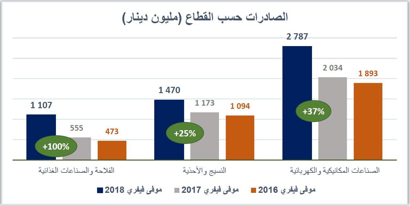 تضاعفت صادرات قطاع الفلاحة والصناعات الغذائية إلى موفى شهر فيفري 2018 لتصل إلى 1107 مليون دينار مقارنة بنفس الفترة من سنة 2017 وسجلت صادرات قطاع النسيج والأحذية تطورا ب 25 % .