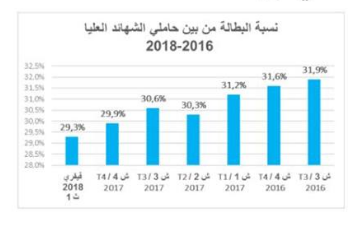 أما بخصوص حاملي الشهائد العليا، فقد تراجعت نسبة العاطلين عن العمل في غضون سنة واحدة من 31.2 بالمائة إلى 29.3 بالمائة في الثلاثي الأول لسنة 2018.