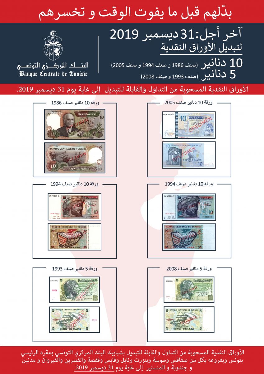 ذكّر البنك المركزي التونسي العموم أنّ يوم الثلاثاء 31 ديسمبر 2019 يمثل آخر أجل لتبديل الأوراق النقدية المسحوبة من التداول من فئات 10 دنانير (صنف 1986 وصنف 1994 وصنف 2005) و 5 دنانير (صنف 1993 و صنف 2008) بشبابيك البنك المركزي التونسي بمقرّه الرّئيسي بتونس وبفروعه بكل من صفاقس وسوسة وبنزرت ونابل وقابس وقفصة والقصرين والقيروان ومدنين و جندوبة و المنستير .