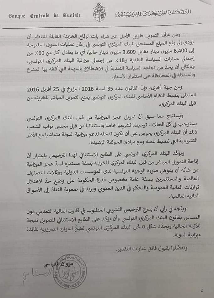 وشدّد المحافظ في مراسلته على أنّ " تمويل الميزانية من قبل البنك المركزي يتطلب في كلّ الحالات ترخيصا تشريعيا خاصا واستثنائيا من قبل مجلس النواب" حتى يكون تدخله لدعم الميزانية متماشيا مع الأطر التشريعية التي تضبط عمله ( القانون عدد 35 لسنة 2016 ) ولمبادئ الحوكمة الرشيدة.
