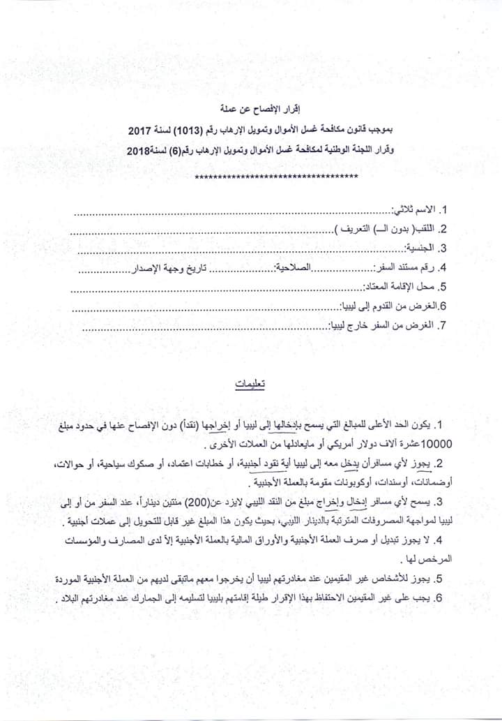 أعلنت اللجنة الوطنية الليبية لمكافحة غسيل الأموال وتمويل الإرهاب  في قرار لها بشأن تحديد المبالغ الواجب الإفصاح عنها عند الدخول إلى ليبيا أو الخروج منها، رفع المبلغ المسموح  به دون تصريح من  خمسة إلى عشرة ألاف دولار ، أو مايعادله  من العملات الأجنبية الأخري.