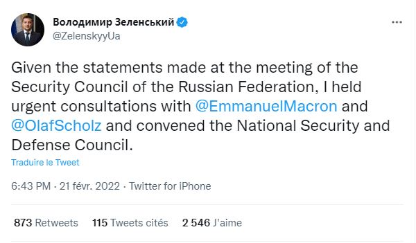وقال زيلينسكي، في تريدة على موقع "تويتر": "نظراً للتصريحات التي صدرت خلال اجتماع مجلس أمن روسيا الاتحادية، أجريت مشاورات عاجلة مع الرئيس الفرنسي إيمانويل ماكرون والمستشار الألماني أولاف شولتس وعقدت اجتماعاً لمجلس الأمن والدفاع القومي".