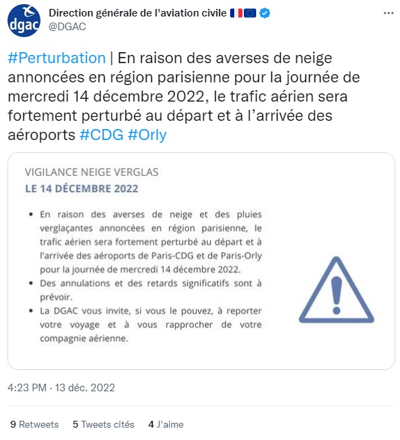 أعلنت الإدارة العامّة للطيران المدني بفرنسا، اليوم الثلاثاء 13 ديسمبر 2022، تسجيل اضطرابات وإلغاء لعديد الرحلات الجويّة، غدا الأربعاء، من وإلى مطاريْ باريس، وهو ما مطار أورلي ومطار رواسي.