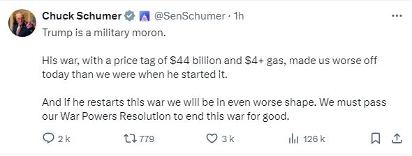 وأشار شومر إلى أنّ حربه كلّفت الولايات المتحدة 44 مليار دولار، وزيادة أسعار البنزين إلى أكثر من 4 دولارات، وجعلت الوضع الاقتصادي أسوأ مما كان عليه قبل الحرب.