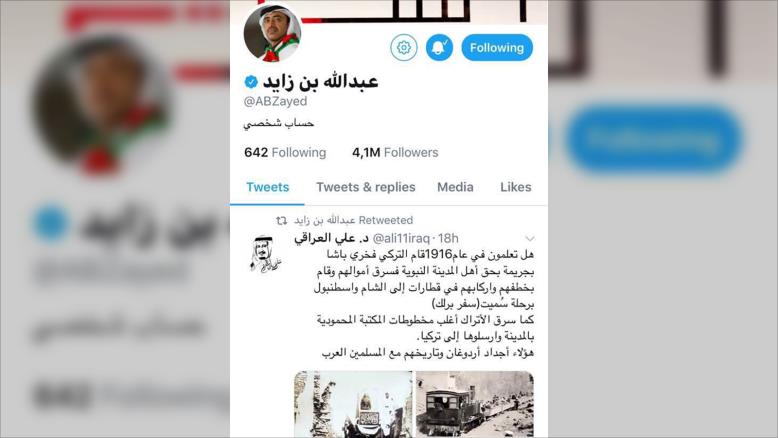 أعرب الرئيس التركي رجب طيب أردوغان عن استنكاره الشديد لتغريدة وصفها بالـ''مُسيئة للعثمانيين والأتراك''، كان وزير خارجية الإمارات عبد الله بن زايد قد نشرها على حسابه “تويتر”.