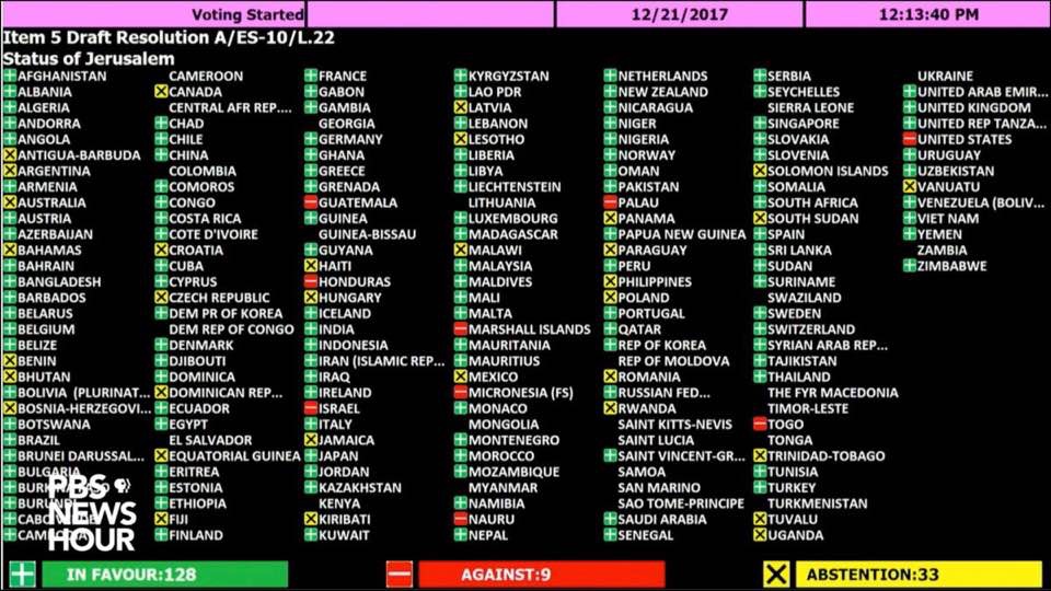 وصوتت 128 دولة لصالح قرار سحب الإعتراف الأمريكي، فيما عارضته 9 دول، وامتنعت 35 دولة عن التصويت، وذلك في جلسة طارئة بطلب من تركيا واليمن.