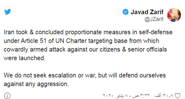 وصرّح وزير الخارجية الإيراني جواد ظريف، في تغريدة نشرها على حسابه بتويتر "دفاعا عن النفس اتخذنا إجراءات متكافئة وانتهينا.. نحن لا نسعى للتصعيد أو الحرب".