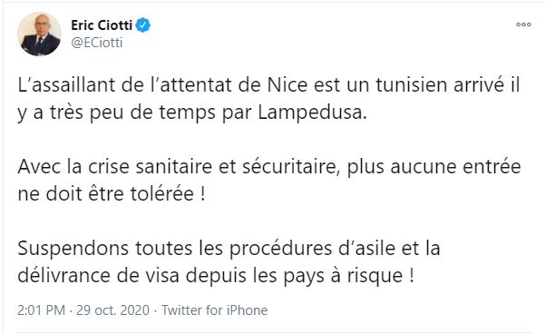 أكد النائب في البرلمان الفرنسي من حزب ''الجمهوريون'' ''إيريك سيوتي''، في تغريدة على تويتر اليوم الخميس، أن منفّذ عملية الطعن الإرهابية أمام كنيسة ''نيس'' صباح اليوم الخميس 29 أكتوبر 2020، هو شاب تونسي الجنسية كان قد دخل التراب الفرنسي مؤخرا قادما من جزيرة لامبيدوزا الإيطالية.