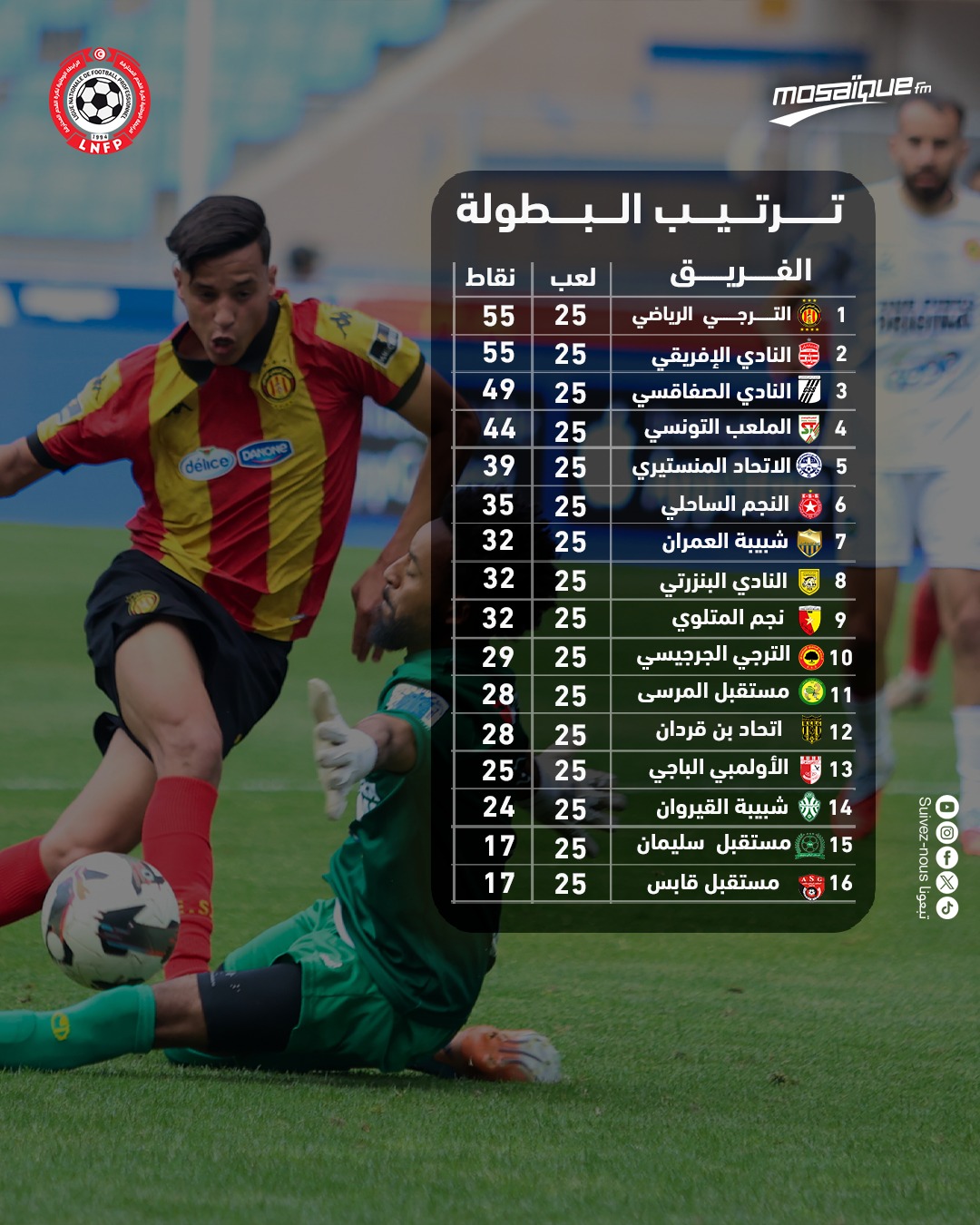 ويحتل الترجي الرياضي التونسي الصدارة رفقة النادي الإفريقي برصيد 55 .